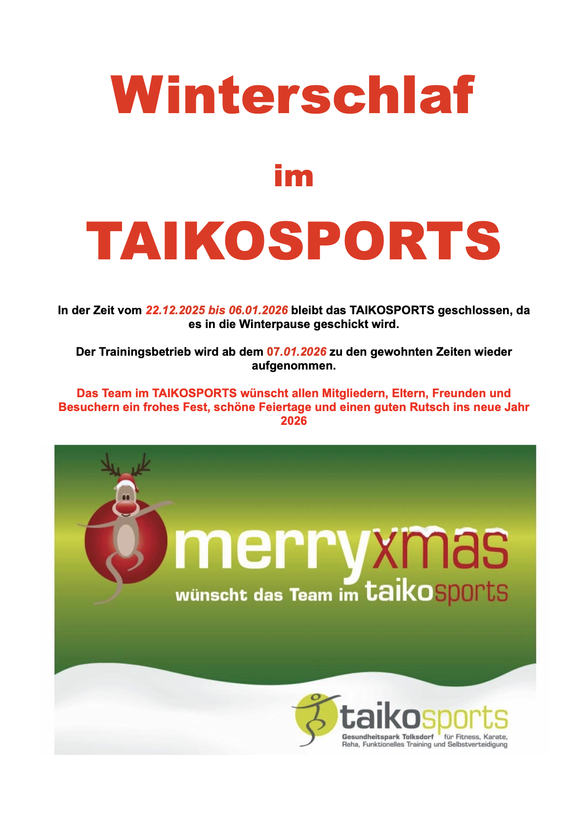 Winterschlaf im TAIKOSPORTS!!!!! In der Zeit vom 22.12.2025 bis 06.01.2026 bleibt das TAIKOSPORTS geschlossen, da es in die Winterpause geschickt wird.